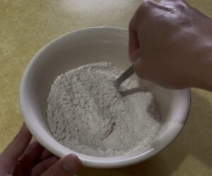Create a well with the back of your whisk or a spoon in the middle of the bowl.