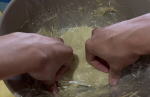Wrap the dough in plastic wrap and let it chill in the fridge for at least an hour.