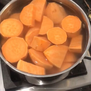 - In a large pot, bring water to a boil. Once boiling, add the sweet potatoes and cook for about <strong>15–20 minutes</strong> or until fork tender. Drain and set aside.