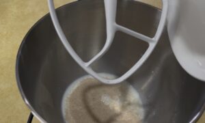 • Get a paddle attachment then combine warm milk, yeast, and granulated sugar then stir to dissolve the yeast.
