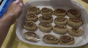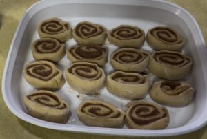 • Place the rolls in a greased 9×13 inch baking dish. Cover and let rise for 30 minutes.