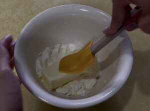 • In a large bowl, beat together softened cream cheese and butter until smooth and creamy.