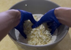 - Cut in the cold butter using a pastry blender or your fingers until the mixture resembles coarse crumbs.