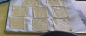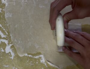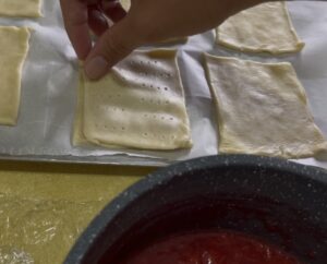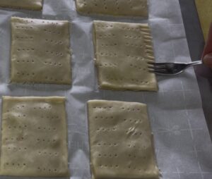 - Use a knife or pastry wheel to cut the dough into even rectangles (about 3×4 inches).