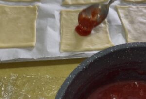 - Spoon about 1-2 tablespoons of cooled strawberry filling onto the center of each rectangle, leaving a small border.